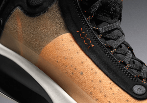 Cụ thể, các tông màu chủ đạo là màu đen và cam xuất hiện ẩn bên dưới lớp vỏ bán mờ trong suốt ở phía trên cùng với các điểm nhấn rực rỡ hơn của màu cam neon được tìm thấy ở gót giày, họa tiết Jumpman ở lưỡi và các chi tiết lacesta mang lại cho đôi Jordan này một cái nhìn đầy thu hút và độc đáo.