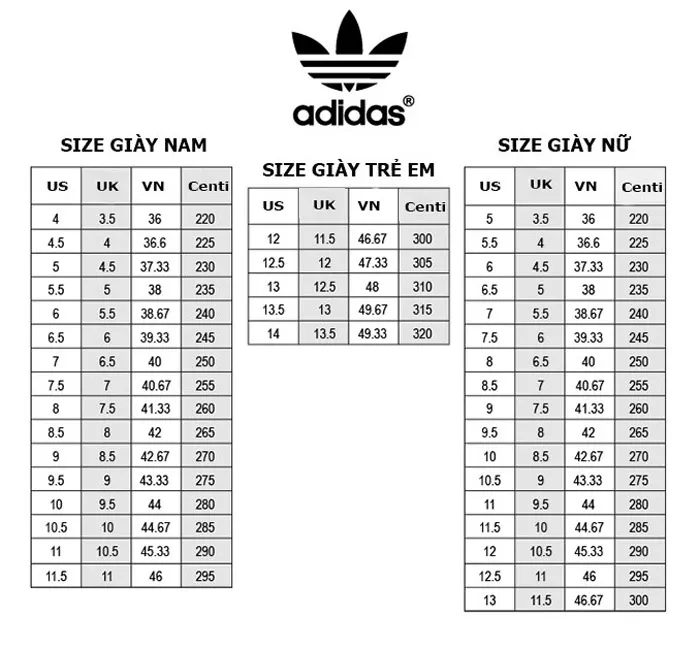 Sau khi có kích thước chân, bạn cần tra cứu bảng size giày của Adidas để chọn được size phù hợp. Bạn có thể tìm bảng size trên trang web chính thức của Adidas hoặc tại các cửa hàng phân phối chính hãng. Bảng size thường bao gồm các số đo theo đơn vị cm và quy đổi ra các size theo tiêu chuẩn Mỹ (US), Anh (UK) và Châu Âu (EU).