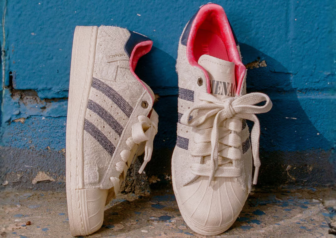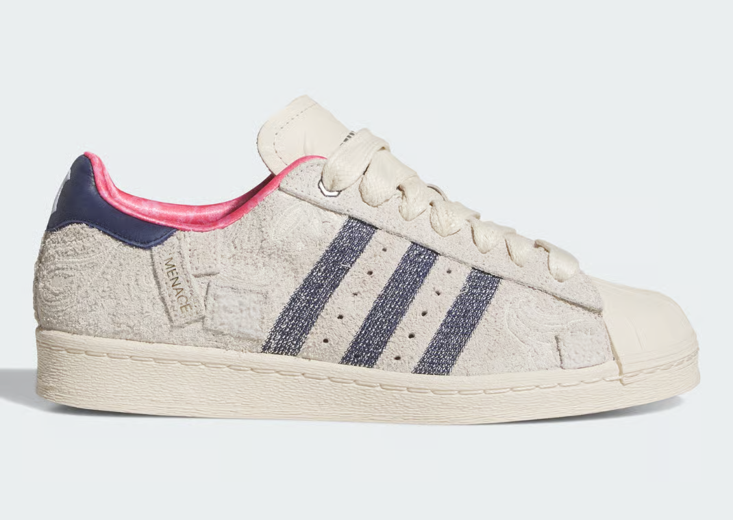 Đánh dấu cột mốc 12 năm thành lập, Menace bắt tay cùng adidas để cho ra đời phiên bản đặc biệt Menace x adidas Superstar “Heirloom”. Đôi giày mang thiết kế sang trọng nhưng vẫn giữ nét bụi bặm đặc trưng, với phần upper bằng da lộn màu kem, chi tiết đường cong tinh tế. Ở phần gót giày, logo “M” của Menace hiện lên bằng font chữ kiểu Yankees đối xứng với biểu tượng Trefoil kinh điển, biểu trưng cho sự kết nối giữa hai thế giới: di sản và hiện đại. Tổng thể đôi giày vừa mang nét cổ điển đặc trưng của dòng Superstar, vừa có tinh thần nổi loạn và đường phố đậm chất Menace. Đế giày và gót xanh navy kết hợp cùng lớp lót hồng pastel mang lại sự cân bằng giữa cổ điển và hiện đại. Phiên bản này không chỉ là lời tri ân cho hành trình 12 năm của Menace mà còn thể hiện nỗ lực của adidas trong việc tái kết nối với tinh thần “đường phố đích thực”.