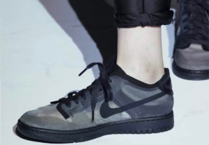 Upper được chế tác từ một loại lưới trong mờ nhẹ và kỹ thuật, cho phép diện mạo của đôi được biến đổi hoàn toàn tùy thuộc vào màu sắc của đôi tất được mang. Đây là kiểu đổi mới mà CdG nổi tiếng và nó hoàn toàn phù hợp với Dunk Low. Thương hiệu Nike xuất hiện dưới dạng biểu tượng Swoosh ở hai bên, trong khi thương hiệu kép hiện diện trên đế để tạo nét sang trọng.